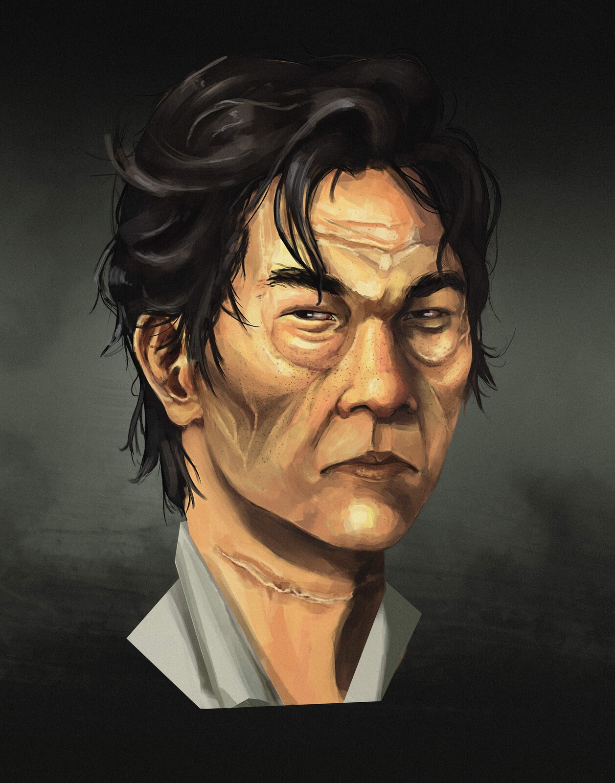This piece was really interesting to draw as due to his back tattoo it lead me to do a fair amount of research into Irezumi the Japanese art of tattooing. Leading to a side drawing to fully explore what this back piece would look like and how it could build on the character.